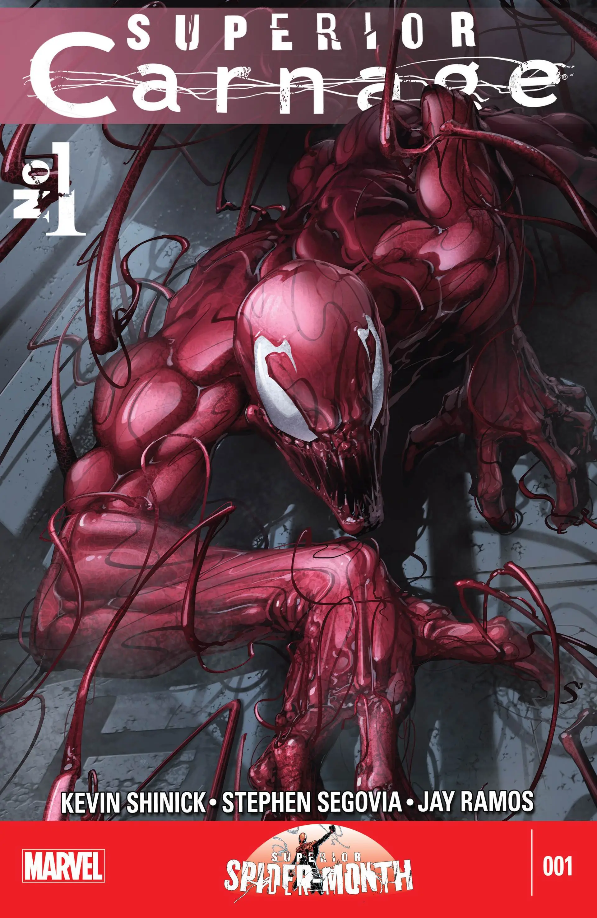 SUPERIOR SPIDER-MONTH GETS SINISTER WITH THE RETURN OF CARNAGE! LOCKED AWAY IN AN ASYLUM, IT LOOKS LIKE CARNAGE IS GONE FOR GOOD-BUT HIS FELLOW INMATES HAVE OTHER PLANS… WILL THEY SUCCESSFULLY WAKE THE MONSTER? OR WILL THIS HIDEOUS EXPERIMENT CREATE THE MSOT POWERFUL, DANGEROUS, MANIACAL CARNAGE YET… A SUPERIOR CARNAGE? KEVIN SHINICK (Avenging Spider-Man, Robot Chicken) and STEPHEN SEGOVIA (Extreme X-men, Thor) come together to create a story so grotesquely gratifying you wont be able to look away!