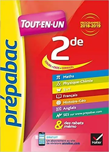 En un seul ouvrage, toutes les matières de la Seconde : maths, physique-chimie, SVT, français, histoire-géo, anglais, SES (prise en compte des aménagements de programme 2017 pour les maths et la physique-chimie).