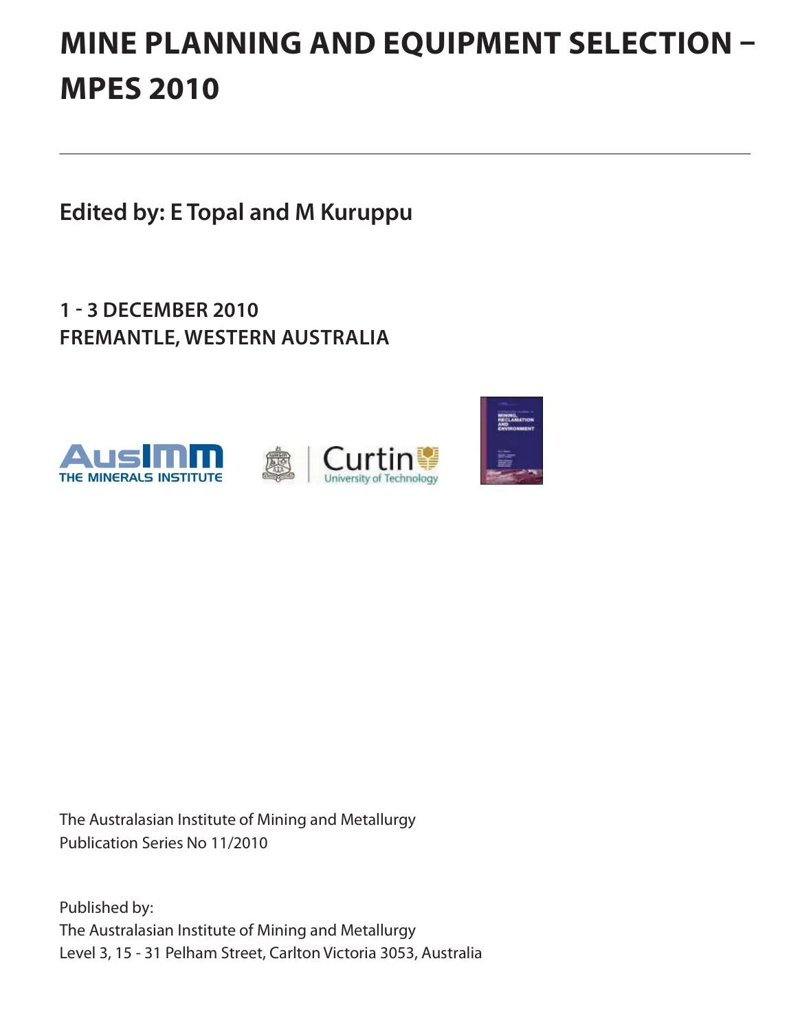 Mine Planning and Equipment Selection - MPES 2010 By Topal, E.; Kuruppu, M. (Eds.)