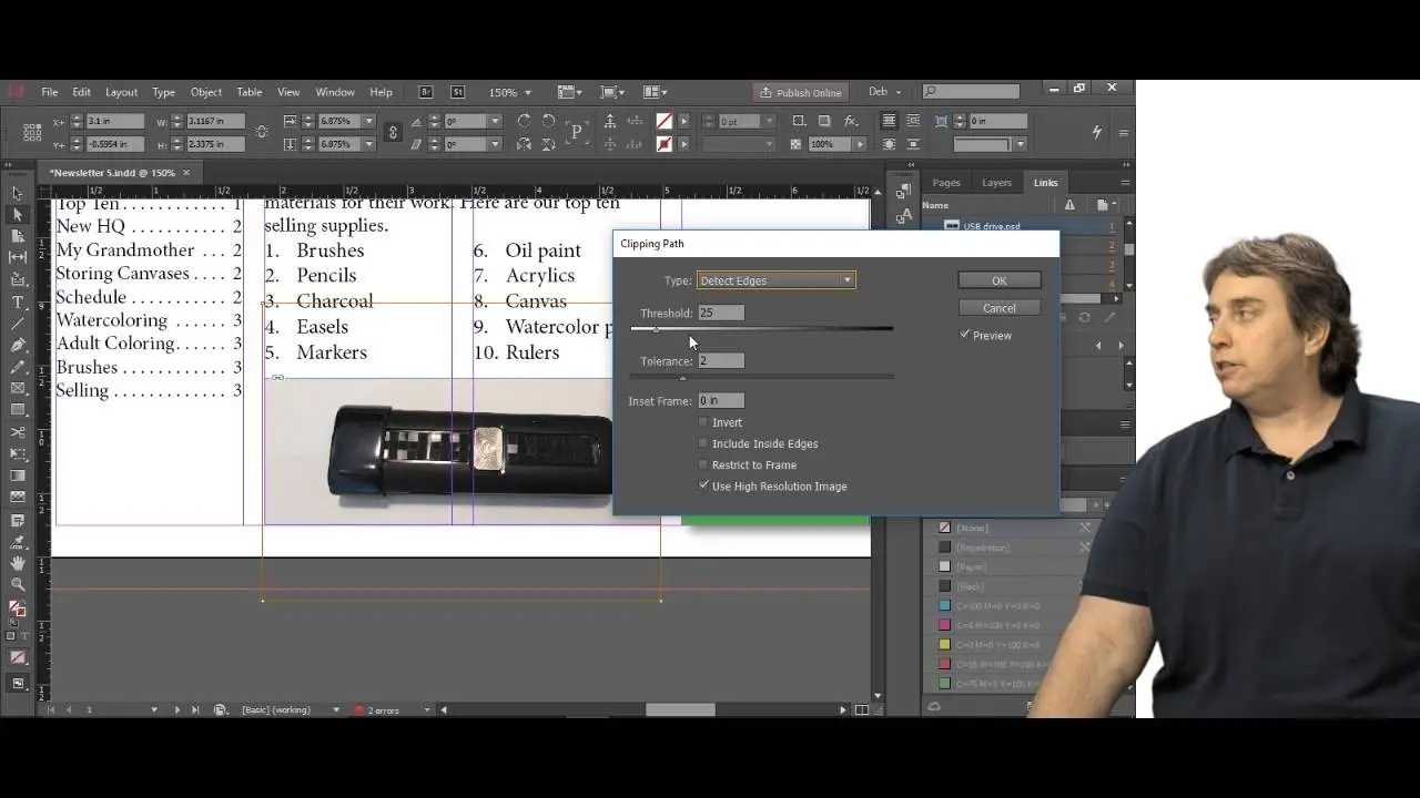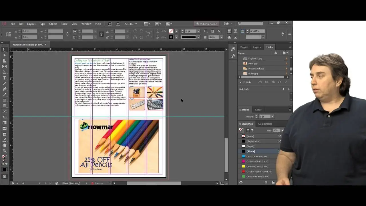 This advanced course will take a basic knowledge of InDesign to the next level. In this course, students will work with saving to previous versions, saving templates, and use different page sizes and sections. Students will learn to modify text flow with breaks, tabs, jump lines, and use text on a path and text outlines, and learn advanced text options. Additionally, students will work with advanced text styles, nested styles, and understand hyphenation, justification, and keep options. Students will use advanced place options, including placing Illustrator files, InCopy and anchored objects. Students will work with the InDesign illustration tools, organize swatches, convert tables, and learn about creating interactive elements, as well as work with long documents.