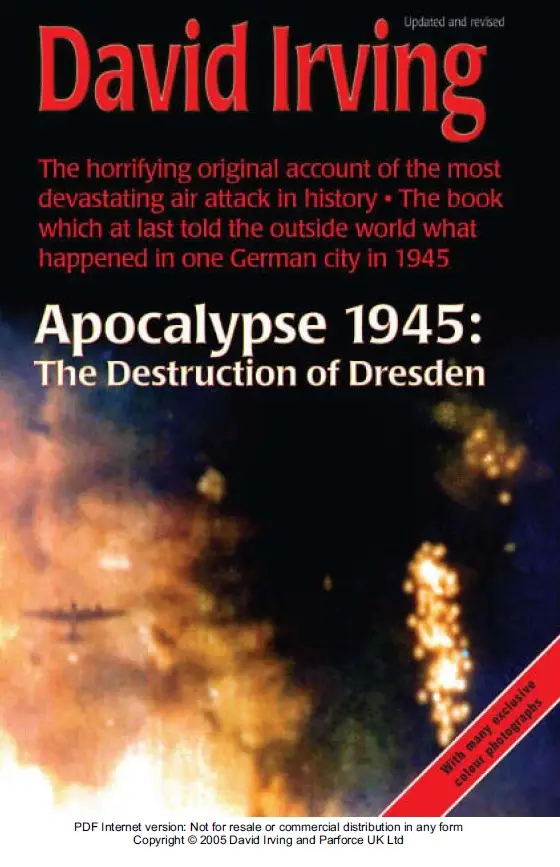 AT 10.10 P.M. ON THE NIGHT of February 13-14, 1945 the R.A.F. Master Bomber broadcast the cryptic order: 'Controller to Plate-Rack Force: Come in and bomb glow of red T.I.s as planned.' The ill-famed attack on Dresden had begun. The target city was among Germany's largest, but it alone had developed no single major war industry. The German authorities had made it a centre for the evacuation of wounded servicemen, and by February 1945 most schools, restaurants, and public buildings had been converted into military hospitals. In selecting Dresden for this purpose, the German government probably hoped that this, one of the most beautiful cities in Europe, often compared with Florence for its graceful Baroque architectural style, would be spared the attentions of the allied bombers. By 1945, the legend was deeply entrenched in the population's mind that Dresden was a city that would never be bombed. It was not to be. In February 1945, with the Soviet armies making striking advances in their invasion of Silesia and East Prussia, and when the war's political and military directors were meeting at Yalta, Mr Winston Churchill was urgently in need of some display both of his offensive strength and of his willingness to assist the Russians in their drive westwards. Dresden, the 'virgin target' just seven miles behind the eastern Front, became the victim of Mr Churchill's desire for a spectacular blow. By a combination of delays and poor weather, the raid, the climax of the strategic air offensive against Germany, and the most crushing air-raid of the war, was not delivered until the day that Mr Churchill was departing from Yalta. The city was undefended – it had no guns, and even the German night-fighter force was grounded by Bomber Command's brilliant tactics of deception and trickery. It had no proper air-raid shelters. On the night of the attack, Dresden was housing hundreds of thousands of refugees from Silesia, East Prussia, and from western Germany in addition to its own population of 630,000. Up to 100,000 people, perhaps more, were killed in two to three hours, burned alive, that night. Yet until the author's first book on it appeared in 1963 the raid on Dresden scarcely figured in any official indices of the war. A veil had been drawn across this tragedy. Why was there this official silence about the Dresden tragedy? Certainly little discredit reflected on the officers and men of the bomber forces; equally the two commanders, Sir Arthur Harris and General Carl Spaatz, were not acting out of hand. The directives and orders confronting them were painfully clear. Stung by foreign revulsion at this new St. Valentine's Day Massacre, the British Prime Minister - who had ordered it - penned an angry minute to his Chief of Staff, even before the war ended, rasping that, "The Destruction of Dresden remains a query against the conduct of Allied Bombing." It is from this remarkably forgetful minute that the subtitle of this documentary account is taken. For the first time, the full story, ommitting nothing, of the historical background to this cruel blow and of its unexpected political consequences, is told. First three, and now forty years' research in England, Germany, and the U.S.A., and the active cooperation of the military authorities in London, Washington, and Moscow, produce a detailed account of this tragedy.