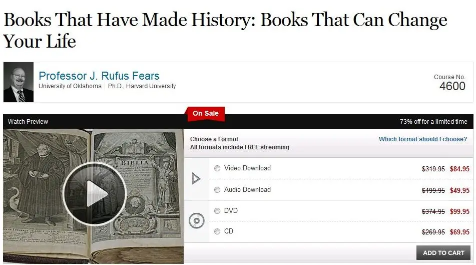 This course does not analyze the literature or discuss it in detail; rather, it focuses on intellectual history and ethics. What Professor Fears does is to take the underlying ideas of each great work and show how these ideas can be put to use in a moral and ethical life.