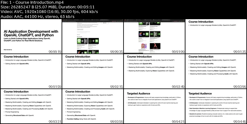 "AI Application Development with OpenAI, ChatGPT, and Python" is a comprehensive course designed to teach you how to harness the power of OpenAI's APIs and tools to build advanced AI applications. You'll explore the fundamentals of Large Language Models (LLMs), understand the evolution of ChatGPT, and gain hands-on experience in using OpenAI's capabilities for text, image, and audio processing. The course covers essential topics such as prompt engineering, structured data generation, and function calling, enabling you to create dynamic and interactive AI solutions. Whether you're a developer, data scientist, or AI enthusiast, this course provides the knowledge and skills to develop cutting-edge AI applications using Python and OpenAI.1. Getting Started with the CourseThis section introduces the course, outlining what you can expect to learn and achieve by the end of it. We will cover how to set up your environment, download course materials, and access the resources needed to follow along.2. Introduction to Large Language Models (LLMs), OpenAI & ChatGPTDive into the world of LLMs with an in-depth look at OpenAI's ChatGPT, its architecture, and how it’s revolutionizing AI-driven language processing. Explore the history of how we interacted with computers before LLMs and how it has evolved since the release of ChatGPT. You'll trace the evolution of LLMs and understand the complexities involved in training these models.3. OpenAI APIs: Your First Steps to MasteryMaster the essential steps for working with OpenAI APIs, from setting up your environment on Mac or Windows to making your first API requests. This section covers everything from installing Python, managing dependencies using Poetry or pip, configuring your OpenAI API key, and interacting with GPT models using OpenAI clients.4. Mastering Multimodality: Creating and Editing Images with OpenAILearn how to leverage OpenAI's capabilities to generate and edit images. This section introduces you to multimodality in AI, combining text and image generation. You’ll explore how to create images, edit them, and use OpenAI's variation functions to enhance creativity.5. Mastering Multimodality: Exploring Vision Capabilities with OpenAIDelve into the vision capabilities of OpenAI. You'll learn how to analyze images using URLs, process base64-encoded images, and understand the limitations of OpenAI’s Vision API. This knowledge will help you integrate vision-based AI solutions into your projects.6. Mastering Multimodality: Creating and Processing Audio with OpenAIExplore how OpenAI handles audio data, including text-to-speech conversion, speech-to-text transcription, and language translation using the Whisper API. You will gain hands-on experience in converting written text into speech and transcribing spoken language into text.7. Prompt EngineeringThis section covers the art of crafting prompts to guide AI models in generating accurate outputs. You’ll learn about various prompting techniques, including zero-shot and few-shot prompting, and how to structure prompts to achieve desired results. You’ll also explore how to protect prompts from injection attacks.8. Generating Structured Data with OpenAIUnderstand how to generate structured data using OpenAI's LLMs. This section includes prompt engineering techniques, using Pydantic for data validation, and advanced methods for structured outputs. You'll learn how to manage structured data in Python efficiently and how to combine Pydantic with prompt engineering for accurate data generation.9. Function Calling using Tools with OpenAIDiscover how to use OpenAI for function calling to interact with external systems, retrieve real-time data, and build interactive applications. You'll learn how to connect OpenAI to APIs for real-time data, such as weather updates and stock prices, making your AI applications more dynamic and responsive.This comprehensive course will equip you with the skills needed to build AI-powered applications using OpenAI's powerful tools and APIs. Join us as we embark on this journey to master the art of AI application development with hands-on projects and real-world examples.