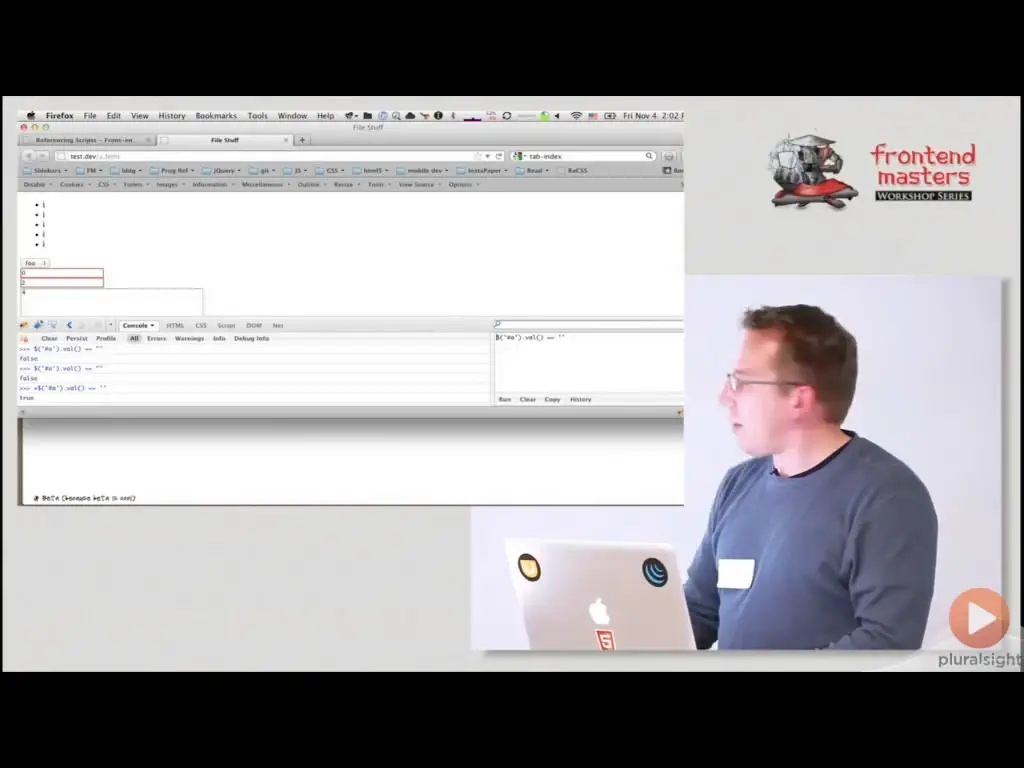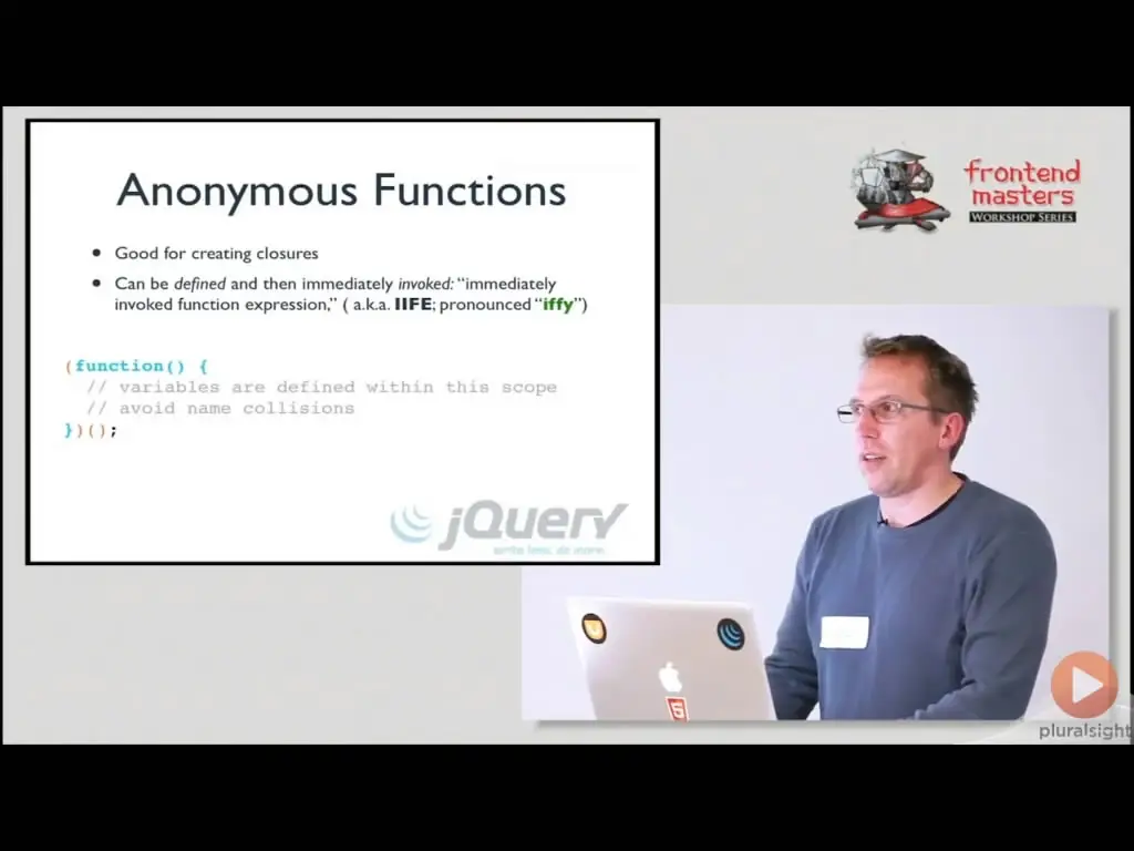 Karl Swedberg, author of Learning jQuery and the jQuery API Documentation (api.jquery.com), teaches you what you need to know about the JavaScript language before diving into jQuery; including closures, anonymous functions, and implicit versus explicit iteration. If you missed out on a formal education on pure JavaScript, this workshop will help get you up to speed on the language.