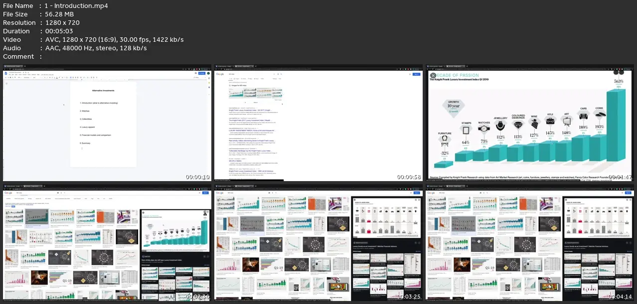 1. INTRODUCTION- What is alternative investing 2. WATCHES- Introduction to the world of watches - Detailed walkthrough and explanation, on how to pick the right brand- Price explanation (What is the right price and why)- How to make a profit in the watch market3. COLLECTIBLES- Introduction to the world of collectibles (art world)- Detailed walkthrough and explanation, on how to pick the right artist- Price explanation (What is the right price and why)- How to make a profit in the art market4. LUXURY APPAREL - Introduction to the world of luxury apparel (handbags) - Detailed walkthrough and explanation, on how to pick the right brand- Price explanation (What is the right price and why)- How to make a profit in the luxury apparel market5. FINANCIAL MODELS- Different financial models for each item- Profit projection (starting capital, duration, return on investment)6. SUMMARY - Overview of all the key points