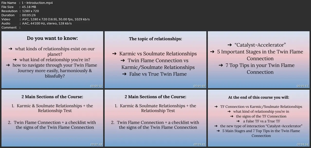 Do you want to know what kinds of relationships exist on our planet and how they differ from each other?Do you wonder what kind of relationship you are in: Karmic, Soulmate Relationships, or maybe in a Twin Flame Connection?Are you interested in the signs, the difference, the stages of the Twin Flame Connection?Do you want to know how you can help yourself navigate through your Twin Flame Journey more easily, harmoniously and blissfully?Then this course is definitely designed for YOU!Welcome to the Karmic, Soulmate Relationships vs Twin Flames Course.Here you will find everything that will help you move through all the personal & spiritual transformations and processes that you face on your path.At the end of this course you will:know the main difference between the Twin Flame Connection and Karmic, Soulmate Relationshipsfigure it out what kind of relationship you are in: Karmic, Soulmate Relationships or Twin Flame Connectionlearn about the unmistakable signs that are unique to the Twin Flame Connectionknow the difference between a False Twin Flame from a True Twin Flamelearn about the new type of interaction "Catalyst-Accelerator"learn about 5 important stages in the Twin Flame Connectionget 7 top tips that will help you in your Twin Flame ConnectionWhy should you take this course right now?You will love this course because you will be able to define exactly what kind of relationship you are in: Karmic, Soulmate Relationships or a Twin Flame ConnectionYou will adore this course because you will get a lot of lot of new ideas, insights, healing, help and support that will help you grow and evolve on your personal & spiritual pathYou need this course because you will be able to find answers to the most difficult and soul-stirring questions.You will enjoy this course because you will no longer be confused and disoriented if you are in a Twin Flame Connection.This course will help you navigate your Twin Flame path, gain stability & acquire confidence in your relationship with your partner.You will like this course because it doesn’t matter if you are familiar with these topics or not, here you will find information that will move your life forward more smoothly and harmoniously.What do you get when you enroll in the Karmic, Soulmate Relationships vs Twin flames CourseLifetime access to the course and future updatesTools & Downloadable ResourcesQuick & Useful Support in the Q&A SectionUdemy Certificate of Completion30 Day Money Back Guarantee – No questions askedThere is absolutely nothing to lose.I am sure that the information that you will hear in this course, you have not heard anywhere else. All the information of this course was carried out directly through the channels of extrasensory perception.With great pleasure I share this information with you.And I really believe that the information in this course will bring you lots of insights, will heal your beautiful heart & soul, will help you & support you in tough periods of your journey.Go ahead and click the enroll button so that you can learn in what kind of relationship you are in. Looking forward to seeing you in the first lecture!With love and respect,The Author Of The Course, Daria.________Information about the author of the course:Hi.My name is Daria Kriebel. I'm an author, writer, energy healer.I'm currently creating my own online courses on various topics, such as -Personal Development-Spiritual Awakening-Love & Relationships-Life MissionFor several years I have been helping people and conducting private consultations in different spheres of their lives.In 2022 and 2023 I received my first and second initiation into Reiki USUI. I’m naturally claircognizant, clairaudient, clairvoyant, clairsentient. Five years ago I came across the serious fast unfolding of my psychic abilities during the tragic events of my life.I am able to conduct unique, pure, deep, serious information through myself directly without any instruments (taro, runes, etc), as well as in a meditative state.I have a desire to share this information with you that relates to our current time and that provides help and support for each person. I went through a lot of challenges in my life and now I sincerely want to help you on this path, healing and revealing everything that is open to me.I study and explore energy processes, principles and laws of everything that is going on now in the world and in people's lives, which includes understanding and knowledge of energy chakras and the flow of energy in them.I have a great desire to share my personal observations and research of this life with you. So join my courses where we will grow and evolve together!