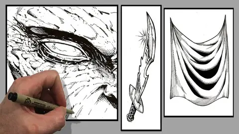 Welcome to My Course, “Traditional Inking for Comics with Pen and Ink!”My name is Robert A. Marzullo and I will be your instructor for this course. I have been inking comics for over 20 years and even though I am a big fan of digital inking there is just something so interesting about pen and ink on real paper. That is the experience I want to share with you in these lessons!In this course I will show you my methods for drawing and inking various textures with traditional tools. You will learn about line weight, textures, cross hatching, and making corrections as you work.This class currently includes 3 project files and the run time is at just over an hour. The first project is drawing and inking a monstrous face. Here we will go over the benefits or random textures and effects. Sometimes you just have to let the pen go and see what happens!For the next project you will draw and ink a fantasy art sword. This will allow us to work on something with more structure and talk about clean lines. This is also a good opportunity to render some chrome like effects.For the third project we will draw and ink some drapery. This is something we need to practice a lot and it will relate to clothing and a variety of other materials. This one is a time lapse with narration since many of the concepts will be redundant.You get all the art files to study and work along with. I will be adding more examples very soon so let me know if there is something you would like to see covered in future lessons.Tools that we will be using in this class -Strathmore 200 Series Bristol Board SmoothMicron Pens - 01, 05Tombow Dual Brush Pen - N15Zebra Pen WFSS4 150Presto Jumbo Correction Pen ( White Out )Pentel Brush Pen Fine PointStaedtler 2mm Lead Holder - 2H leadIf you have any questions and want to share you progress, please add it to the Q+A Section of this course!Thank you for your continued support and good luck with your studies!Robert A. MarzulloRam Studios Comics