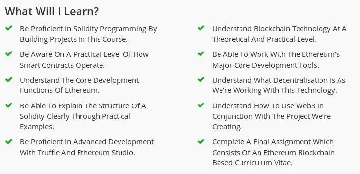 Furthermore, you can be assured that in this course we’ll be deep diving into all of the key aspects in relation ethereum blockchain development, that includes; hands-on developing with solidity, learning how to use core development tools such as Mist, Geth, and Ethereum Studio, advanced Web3 development, how to de-bug your decentralised application, and so much more!