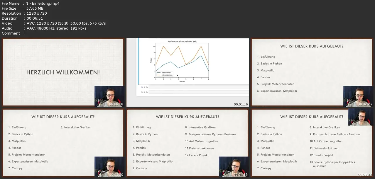 Basics in der Programmiersprache PythonMatplotlib: Hiermit kannst du schicke Diagramme zeichnenPandas: Hiermit kannst du Excel-Dateien mit Python öffnen, und die Daten daraus extrahierenCartopy: Cartopy benötigst du zum Zeichnen von schicken KartendiagrammenJupyter Widgets: In Kombination mit Matplotlib kannst du damit interaktive Grafiken erstellenDatumsfunktionen: Damit wirst du immer wieder zu tun haben, wenn du echte Daten auswerten möchtestEin komplettes Excel-Projekt: Hier schreibst du ein Python-Programm, was Daten aus mehreren Excel-Dateien kombiniert, und daraus eine interaktive Grafik erstellt!