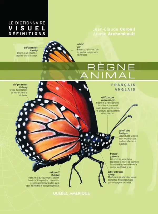 Conçu pour faciliter la recherche par association logique et doté d’un index bilingue, le Dictionnaire Visuel permet de trouver rapidement le nom exact des objets et des phénomènes de la vie courante.Le contenu ciblé de ce volume thématique présente, par l’intermédiare de 300 illustrations, plus de 1 300 termes en français et en anglais liés à la faune. Il enrichira votre vocabulaire de mots tels que ganache du cheval (partie saillante de sa mâchoire inférieure) ou chalaze (filament torsadé qui maintient le jaune au centre de l’œuf), et vous permettra d’identifier le drôle d’oiseau qui fréquente assidûment la marre voisine. Les vues en transparence de l’anatomie des animaux fascineront les curieux, tandis que la ligne du temps illustrée facilitera leur compréhension des grandes périodes de l’évolution de la vie sur Terre.Avec une présentation et une organisation du savoir toujours aussi accessibles et fiables, le Dictionnaire Visuel Définitions - Règne animal offre plus de réponses que jamais aux passionnés des animaux à la recherche du mot juste.