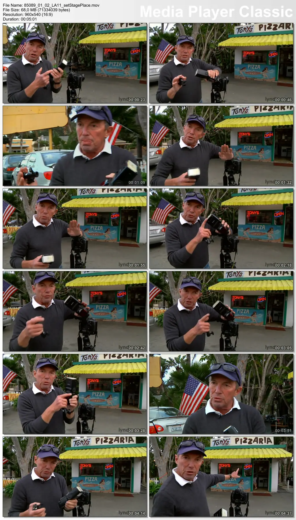 His approach to lighting the scene involves balancing all of the scene’s light sources—the twilight from the sky, the interior light of the pizzeria, the existing lights on the outside of the building, and the output of his strobes—in such a way that the final photo doesn’t appear to have any special lighting at all. He demonstrates a variety of inexpensive lighting tools—clamps, gels, and other light modifiers—to accomplish this goal.