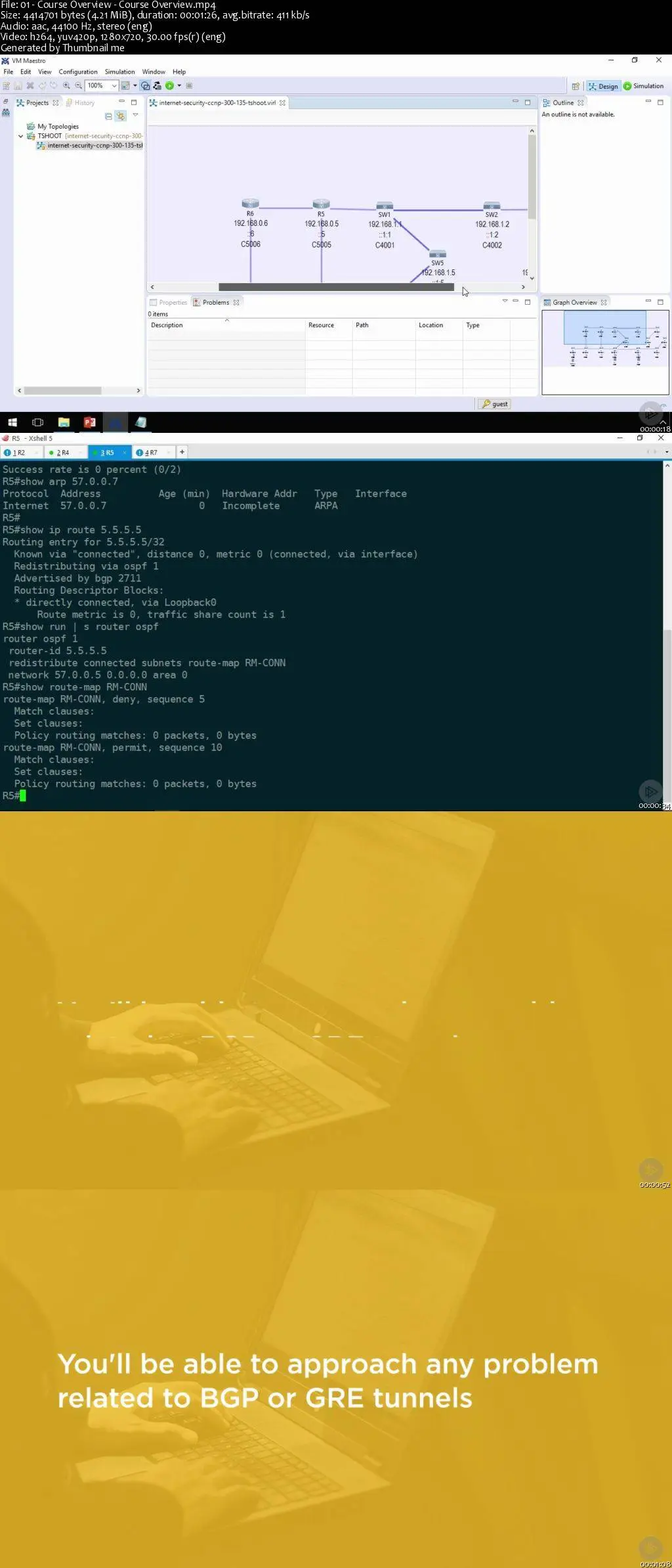 If you need to bridge the gap to get into the network security or service provider space, or if you just need to pass the TSHOOT exam, this course will test and hone fundamental troubleshooting skills related to BGP, redistribution, and GRE tunnels.