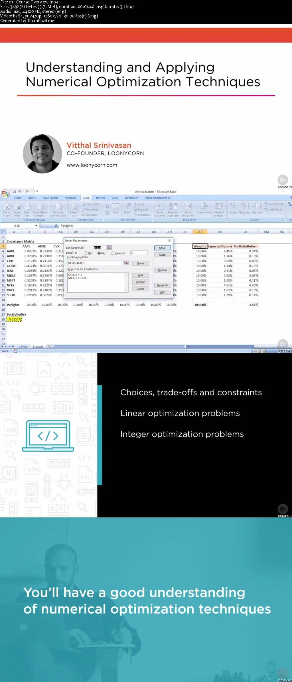 Many optimization problems are conceptually similar to software design patterns - they are generally usable techniques that help with commonly recurring problems. In this course, Understanding and Applying Numerical Optimization Techniques, you'll first learn about framing the optimization problem correctly. Correctly framing the problem is the key to finding the right solution, and is also a powerful general tool in business, data analysis, and modeling. Next, you'll explore linear programming. Linear programming is a specific type of optimization used when the problem can be framed purely in terms of linear (straight line) relationships. Finally, you'll wrap up this course learning about integer programming. Integer programming is similar to linear programming, but it involves adding conditions that our variables be integers. This occurs very often in the real world, but the math of solving these problems is quite a bit more involved. By the end of this course, you will have a good understanding of how numerical optimization techniques can be used in data modeling, and how those models can be implemented in Excel, Python, and R.