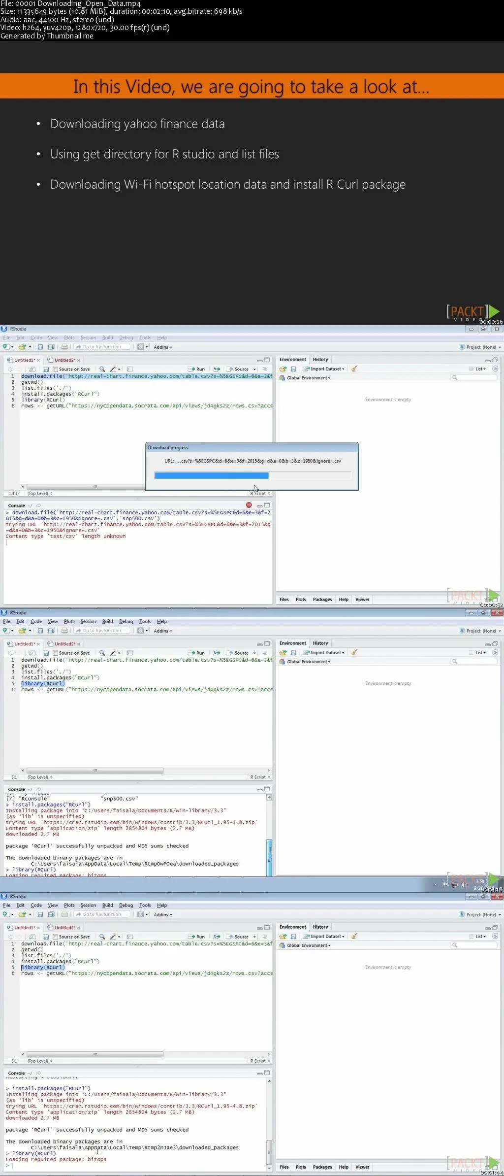 We first begin by learning how to get open data into R, freely available on the internet. Next, we look at extracting data from a variety of sources, such as text files, CSV files, Excel files and son on. Then we also learn about getting data from SQL databases such as MySQL into R and transforming it so that it can be processed. Finally, we learn about scraping web data and extracting it into R.