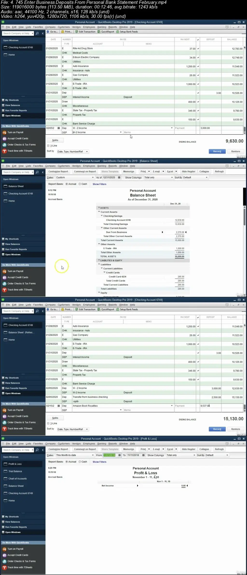 The course will also set up a small QuickBooks business file as a comparison to the personal file, and to show how to account for intercompany or inter-QuickBooks file transactions. In other words, we will track transactions between the business and personal checking accounts in both the individual and business QuickBooks files.