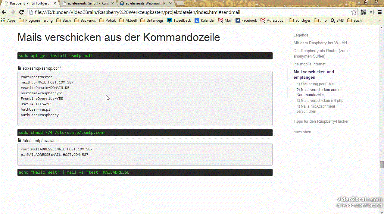 Dieses Video-Training öffnet für Sie einen praktischen Werkzeugkasten: Sehen sie, wie Sie den Minicomputer Raspberry Pi im W-LAN betreiben, damit ins Internet gehen und ihn zum Tausendsassa machen. Sie steuern ihn ganz einfach per E-Mail, bringen ihn dazu, eine SMS zu versenden oder sogar QR-Codes zu entziffern und vieles mehr.