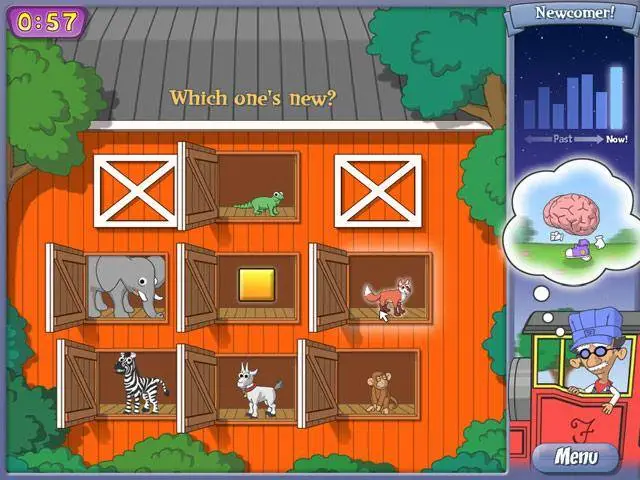 Discover the wild animal terrain aboard The Amazing Brain Train. First, Madeline the Monkey needs to collect all the fruit on the frozen pond. Guide her from one fruit to the next so she can grab it without sliding away. Choose from 15 riveting brain games in five categories such as "Spatial" and "Memory". Become a Puzzle Prodigy and unlock new trophies in the quirky world of Professor Fizzwizzle. Power up your intellect and ride The Amazing Brain Train.
