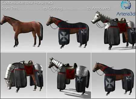 This pack provides a base horse, with elements such as Clothing, Armour, reins, bridle, etc, rigged with the model, which appear as separate mesh groups within the Horse model file.