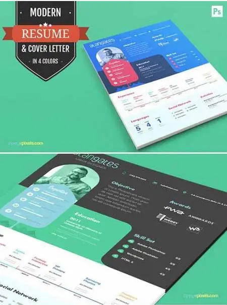 Modern Resume PSD Template with Cover Letter : Detailed layout, beautifully organized and easy to read. A PSD resume template featuring a 1 page, compact, concise and modern design that ensures a positive impression each time.
