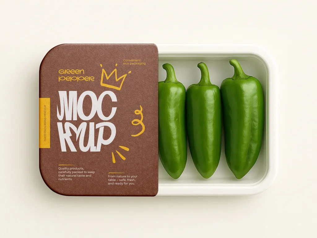 Food Tray Packaging Mockup - Realistic Fresh Green Pepper Container with Label Design 1666887767
