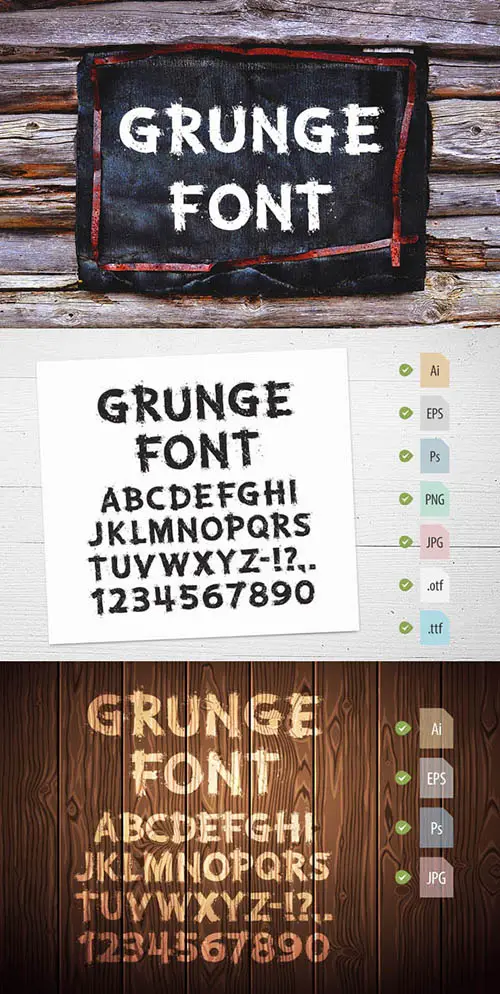 Grunge Letters and Numbers. In this set you will get fully editable vector AI, EPS, transparent PNG, layered PSD and font .ttf .otf files