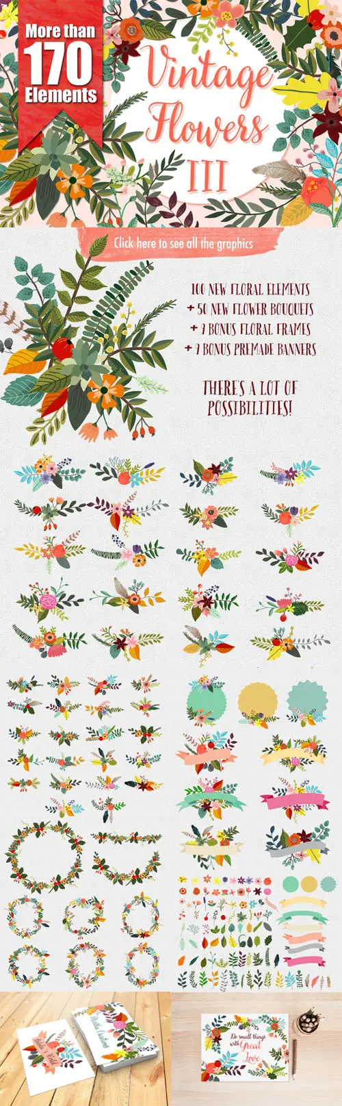 Here is the new Vintage Flowers III. Combine the new flowers with the banners and other design elements. Perfect for greetings, branding, websites, digital media, weddings, apparel, packaging, invites, merchandise designs and much more.