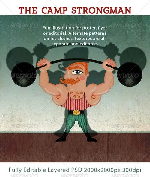 A humorous retro-style illustration of a Strongman displaying himself on stage. The PSD file has many layers with all elements and textures that you see in this preview separated. There are a few choices of patterns.