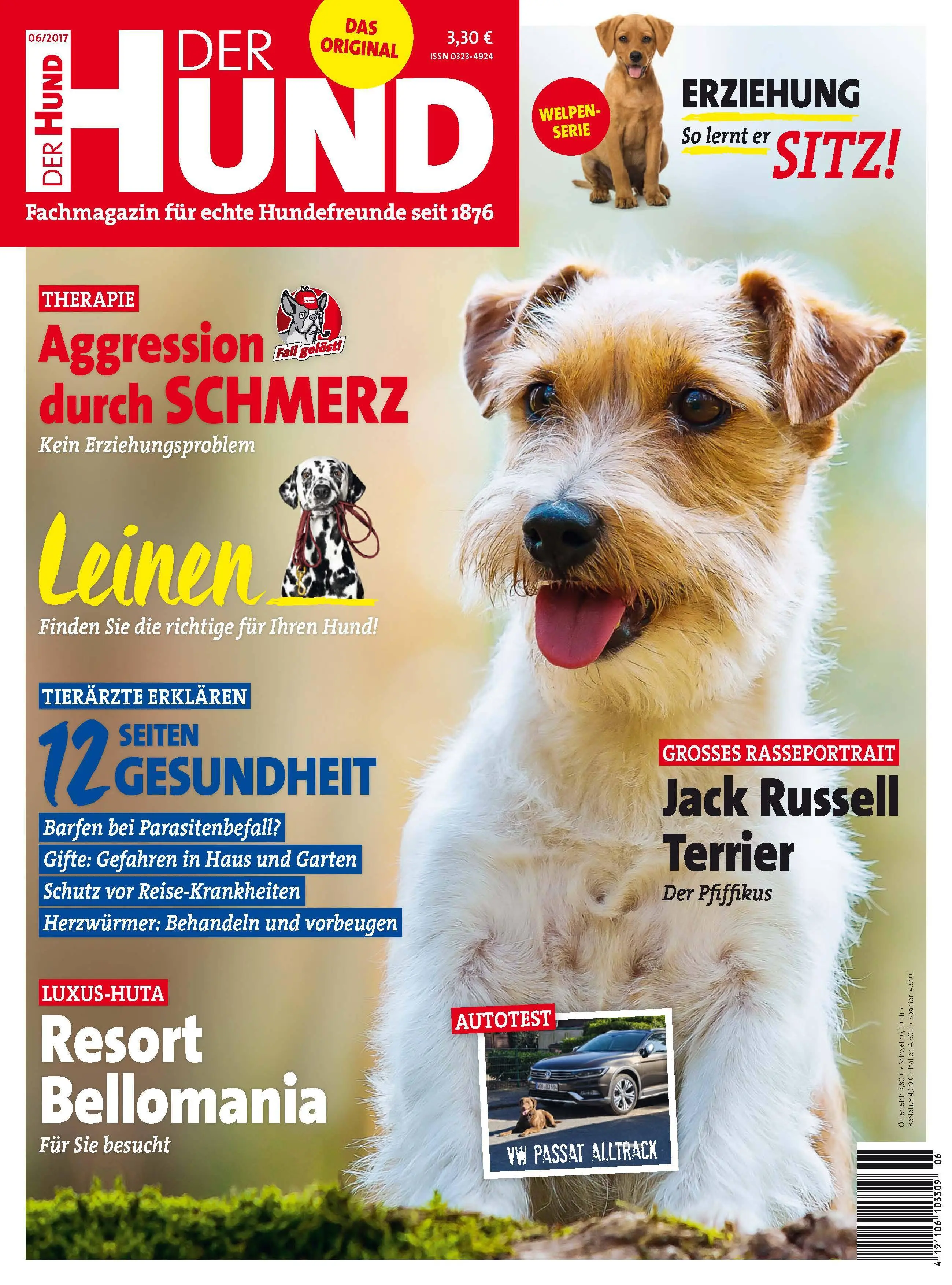 Großes Rasseportrait: Jack Russell Terrier • Aggressiv wegen Schmerzen: Tierphysiotherapie hilft • Im Hunde-Resort • Giftquellen in Haus & Garten, Barfen bei Parasitenbefall, Schutz vor Reise-Krankheiten, Herzwürmer • Hundetrainer privat: Sabine Padberg • 3 flotte Flitzer: Parson Russell, Sealyham, Foxterrier • Passende Leine finden • Welcher Napf für meinen Hund? • Autotest: VW Passat Alltrack • Welpen erziehen: Sitz
