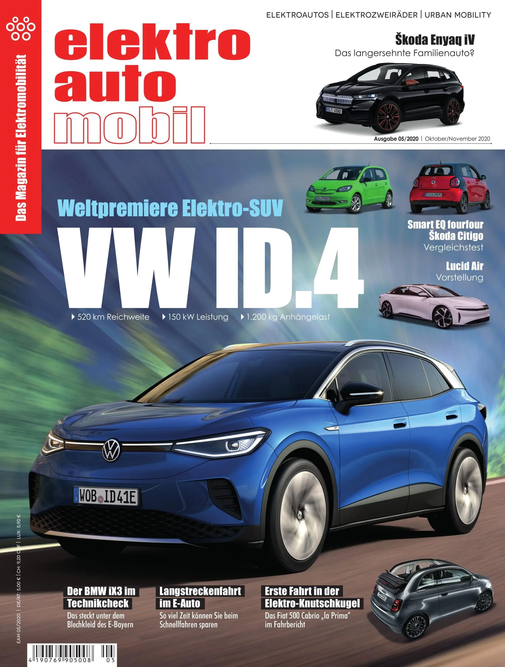 Elektroautomobil Ausgabe 05/2021 (ET: Donnerstag, 07. Oktober 2021): Elektroautos sind auf dem Vormarsch: Über 17 Prozent der Neuzulassungen in Deutschland waren im September mit einem reinen Elektroantrieb ausgerüstet und überholten damit zum ersten Mal die Dieselneuzulassungen. In Österreich lag der Anteil der E-Pkw bereits im August bei über 18 Prozent. Zwei Stromer, die ihren Anteil an diesen Zahlen beigetragen haben dürften und in der Gunst vieler Familien und Dienstwagenberechtigten ganz vorne stehen, sind die beiden MEB-Geschwister Škoda Enyaq iV 80 und VW ID.4 Pro S. Beide sind mit einer 77-kWh-Batterie und einem 150 kW starken Hinterradantrieb ausgerüstet, bieten viel Platz und hohe Alltagsreichweiten. Wer von den ungleichen Zwillingen die bessere Wahl ist, klären wir im großen EAM-Doppeltest. Mit hohem Interesse hat die Branche und haben auch wir die Neuausrichtung der IAA Mobility in München verfolgt. Ob das neue Format Zukunft hat, wird sich noch zeigen. Doch auch wenn Sie nicht in München waren, stellen wir Ihnen die wichtigsten Neuheiten und Studien der Messe vor. Nicht fehlen dürfen dabei die innovativen Zweirad-Ideen von BMW. In dieser Ausgabe fällt zusätzlich der Startschuss für die dreiteilige Serie über das elektrische Fliegen. Finden Sie heraus, wo die Reise in nur wenigen Jahren hingehen könnte, denn wir befinden uns bereits mitten in der dritten Revolution der Luftfahrtgeschichte. Auch die Technikthemen kommen nicht zu kurz: Wir erklären, was die Vorteile eines CVT-Getriebes in einem E-Auto sein können und was es mit den Farben des Wasserstoffs auf sich hat. Weitere Themen in der Oktober/November-Ausgabe von Elektroautomobil: (Un-)Gleiche Zwillinge: Škoda Enyaq iV 80 und VW ID.4 Pro S im Doppeltest; Roadtrip durch Europa: 4.500 Kilometer auf Tour im Audi e-tron GT; Lass doch mal die Sonne rein: Das schicke Fiat 500 Cabrio im Test; Die Rückkehr der Konzepte: Sieben vielversprechende Studien von der IAA Mobility; In Zero Komma nichts: Die Zero DS 11 kW im Alltagstest;