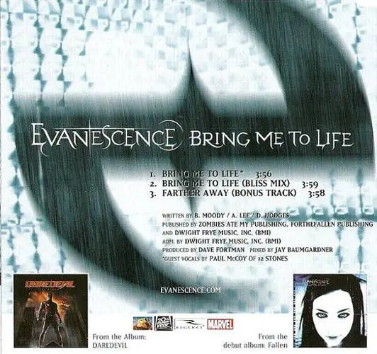 "Bring Me To Life" is the single from American alternative/pop metal band Evanescence, lead by vocalist Amy Lee. This is taken from a Europe CD5, pressed in Austria, featuring two additional songs. This was released by Wind-Up via Epic.