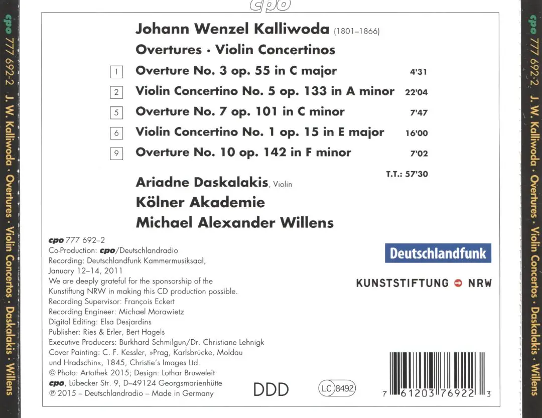 The Bohemian composer Johann Wenzel Kalliwoda (1801-66), perhaps the most important mediator between classicism and romanticism, is now known to experts as an insiders tip between Beethovens, and Schumann and Mendelssohns generation. The new cpo series featuring his overtures and violin concertos most firmly substantiates this judgment. Kalliwoda composed no fewer than twenty-four overtures which may be a record for the 19th c. In their dimensions his violin concertinos, in principle reduced-size violin concertos, are distinguished by highly virtuosic violin figurations.