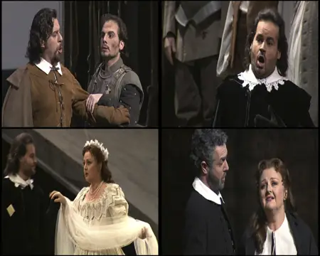 Serban's direction is no-nonsense, although I'm not sure why he has Elvira wandering the stage during the prelude, only to leave when the chorus enters. Is she lost? He gets the finest acting from Edita Gruberova I've ever encountered–her two mad scenes are truly moving–and elsewhere the characters interact with dignity and a correct Puritan reserve, although the chorus sometimes appears as a collection of androids. The direction for the screen (by Toni Bargalló) is excellent, the camera invariably on the right characters, and the mixture of close-ups and not-so close-ups keeps the eye interested.