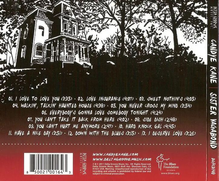 Los Angeles native Candye Kane is the 21st century version of Bessie Smith, singing a tough, smart, sassy, and showbiz-savvy blend of blues and soul that takes no prisoners of any persuasion. Kane has been a lot of things in her life, from a mother and serious student to a pinup girl and actress (both on-stage and in risque movies), and she even did a stint as a serious, full-tilt punk rocker. She’d be just another fringe player in L.A. except for one thing – she can sing like nobody’s business and she has a sexy, intelligent, and passionate musical vision to match her voice. On Sister Vagabond, her tenth album, Kane has really put it all together for her finest studio outing yet, mixing blues, torch soul, and funky swing numbers together into a smart and brassy whole, helped immeasurably by the brilliant guitar playing of longtime cohort Laura Chavez. The album, which opens with a fiery version of Johnny "Guitar" Watson's “I Love to Love You,” never lags or lulls, and Kane sings her heart out on song after song, sometimes with a wink, sometimes with a sexy bravado, and sometimes with an indignant sense of injustice. She turns Brenda Lee's “Sweet Nothin’s” into a brilliant, leering piece of Excello Records swamp pop that rides on Chavez's reverb-drenched guitar lines, and together, they completely reinvent the song. Kane transforms Glenn Frey and Jack Tempchin's “Everybody’s Gonna Love Somebody Tonight” into a blues stomper that replaces sad irony with passionate certainty, and on one of the nine originals that she wrote or co-wrote for the album, “You Can’t Take It Back from Here,” Kane manages to link Louis Armstrong, Storyville, dolphins, and the BP Gulf of Mexico oil spill into a coherent, anguished rant that shows her considerable songwriting abilities. Kane may have a personal bio that suggests she’s a campy airhead, but nothing could be further from the truth. She’s an empowered, intelligent woman with a clear idea of what she’s doing, what era she’s in, and what her politics are, and best of all, she knows how to sing the blues in all of its flavors, and she sings like she’s been there and done that and isn’t afraid of what the end of the night brings. Candye Kane is the real deal, stripper name or not, and this is her best album to date.~ Steve Leggett, All Music