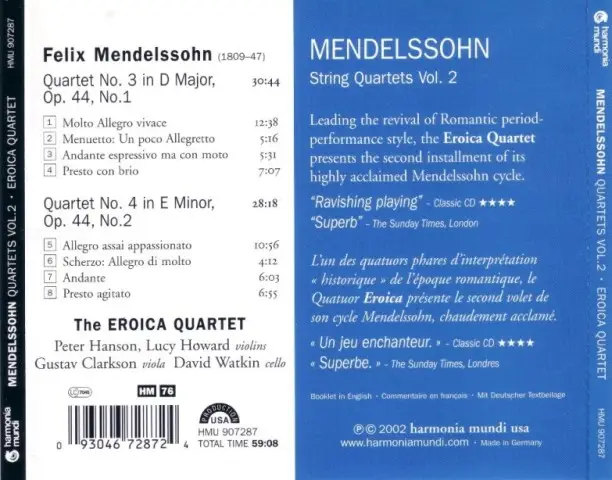 This disc is a perfect example of what a quartet recording, especially of standard repertoire, should do. It is fresh and invigorating and invites us to reexamine the work of a composer whom we think we know very well. In this second volume of its Mendelssohn series, the Eroica quartet simply dazzles–the ensemble's previous foray (which was its debut recording) clearly was no fluke. As far as the Eroica quartet is concerned, Mendelssohn's quartets are the equal of any of his larger-scale works, and these players show that they can generate the muscle and power to match their conception. The first movement of the third quartet is marked "Molto Allegro vivace". But in the Eroica's hands the music isn't simply lively–it's a living, breathing entity. (Forget classical music to soothe and relax you; instead, this is classical music to inflame you!)