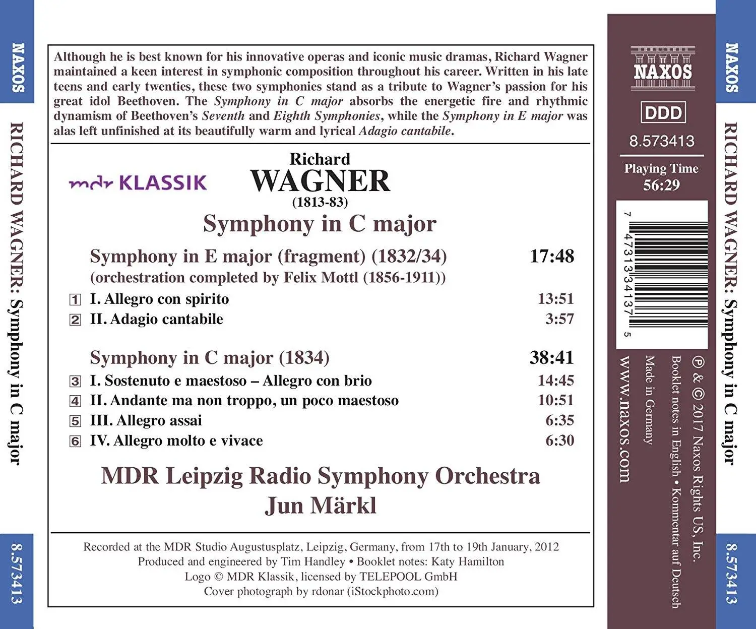 Although he is best known for his innovative operas and iconic music dramas, Richard Wagner maintained a keen interest in symphonic composition throughout his career. Written in his late teens and early twenties, these two symphonies stand as a tribute to Wagner's passion for his great idol Beethoven. The Symphony in C major absorbs the engertic fire and rhythmic dynamism of Beethoven's Seventh and Eighth Symphonies, while the Symphony in E major was alas left unfinished at its beautifully warm and lyrical Adagio cantabile.