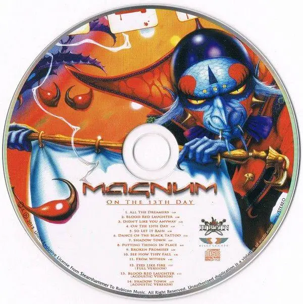 On the 13th Day is the 17th studio album from the rock group Magnum (including Keeping the Nite Light Burning and ignoring Evolution), which was released in September 2012, under the label of Steamhammer Records/SPV. The album entered the charts at number 3 in the UK Rock & Metal Charts, number 5 in the UK Indie Charts, number 28 in the German Album Charts, #36 Swedish Album Charts, #43 UK Album Charts during its first week, making it their most successful album since their reformation in 2002 at the time of its release. Bob Catley has stated that he considers On the 13th Day to be Magnum's rockiest album to date, with the track Dance of the Black Tattoo standing out as particularly heavy for a Magnum album.