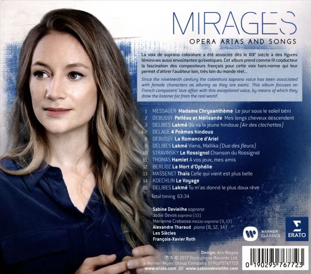 This release by hot French soprano Sabine Devieilhe has multiple strengths that propelled it onto the charts right out of the box, so to speak. Appreciation for Devieilhe's manifest vocal gifts should not obscure the superb work done by recording and mixing engineer Hugues Deschaux, working in the Salle de répétition no. 1 of the Philharmonie de Paris. Especially on the orchestral tracks featuring the group Les Siècles under François-Xavier Roth, Deschaux creates a mysterious sound environment in which Devieilhe seems to hover alluringly in the distance. This fits the programming concept in an uncanny way: Mirages explores exotic heroines in late Romantic French opera and song. This is hardly an uncommon idea in the opera of the period, French or otherwise, but Devieilhe's focus is both close and original: moving outward from the familiar Flower Duet from Lakmé (featuring mezzo-soprano Marianne Crebassa), she touches on both unusual and peripherally related repertory. Both are compelling. Do not miss the rarely heard Quatre Poèmes Hindous of Maurice Delage, composed in India and making the orchestra most evocatively into a traditional Indian instrument. Likewise, Devieilhe links heroines such as Berlioz's Ophelia to the emergence of the themes here. The mix of orchestral and piano-accompanied pieces is slightly jarring, but this is in the main both beautiful and compelling.