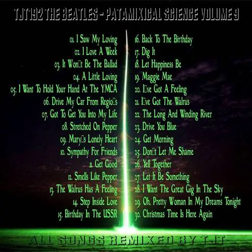 PataMixical Science Volume Nine is a remix project of the music of The Beatles. With the availability of the multi-track files of their music, many have chosen to attempt to create remixes or mash-ups of Beatles music and this is an example. It is the ninth volume of PataMixical Science, a few are quite good, some are nice while others fail miserably but it's all here, credited to TJT.