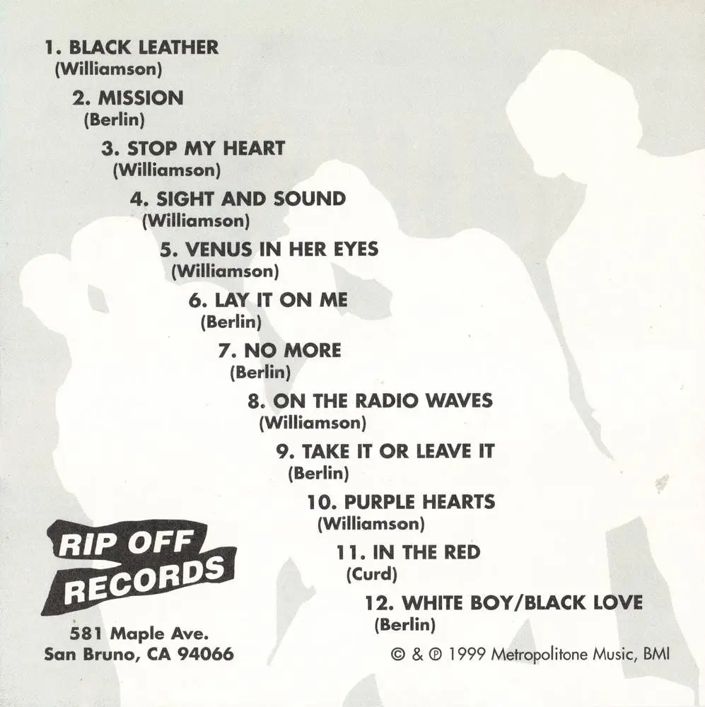 The opening track, "Black Leather," is a convoluted cry for help, and a rockin' punk number at the same time. Other standout tracks include the glammy "Lay It On Me," the desperate "No More," and "White Boy/Black Love," which is reminiscent of The Dead Boys. Overall, a great album for garage punk fans, and a standout in the Rip Off catalog.