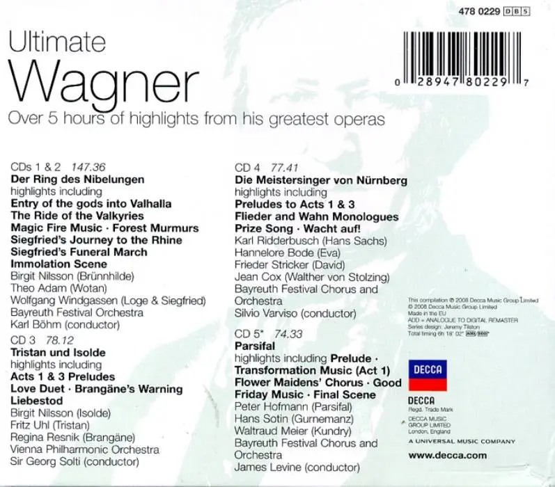 Five CDs of otherworldly beauty and power that revolutionized opera. These 19th-century masterworks include selections and scenes from Der Ring des Nibelungen, Tristan und Isolde, Die Meistersinger von Nürnberg and Parsifal. Performances by Birgit Nilsson, Leonie Rysanek, Waltraud Meier, Wolfgang Windgassen, Peter Hofmann, Theo Adam, Matti Salminen with Georg Solti, James Levine and others.