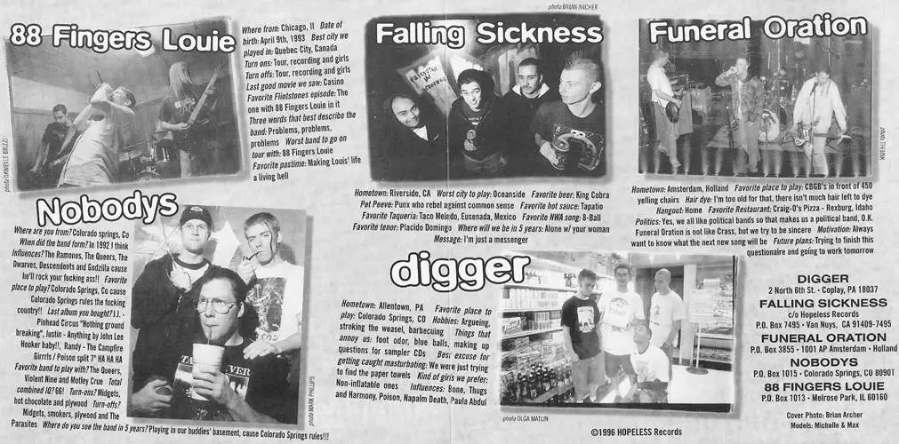 Following in the tradition of other indie, but well-funded punk labels such as Lookout!, Fat Wreck Chords and Epitaph come a CD sampler under five bucks. This time we have Hopeless Records following into this trend, but not to say that this is a bad idea or anything. Rather, it's a clever and affordable way to discover some new bands that label is putting out. So in the long run everybody wins, the kiddies have a bigger collection and the label makes some extra cash. In this case, Hopelessly Devoted To You is a best of galloping pop-punk from the West Coast -except for Funeral Oration who hail from Amsterdam. So yeah, those guys stand out as well as 88 Fingers Louie -who even contribute a cover of the Misfits - "Night of the Living Dead"; Schlong, White Kaps and Digger; all whom have that immature, snotty high school mentality pop-punk, but that's where all the fun is.
