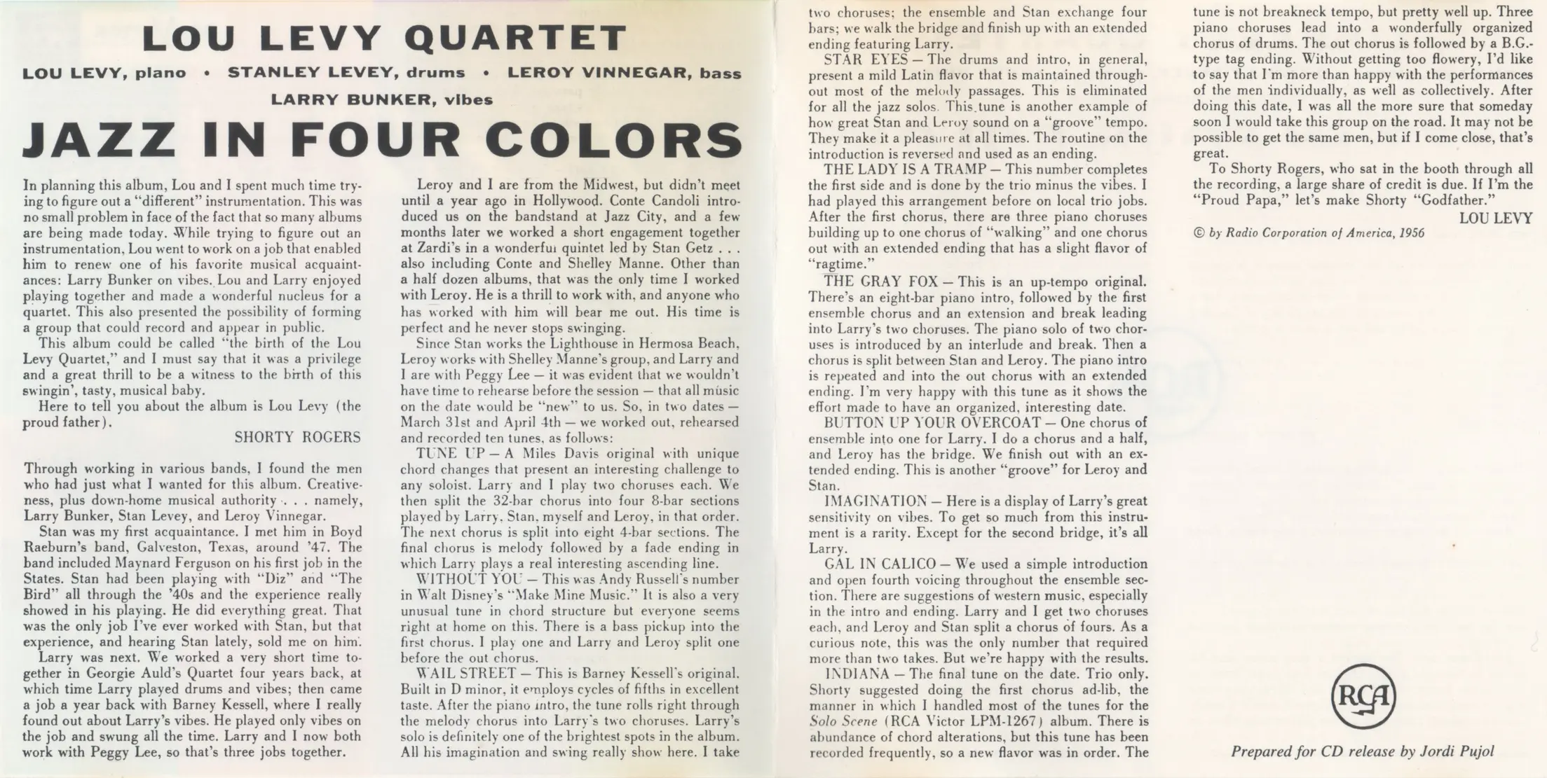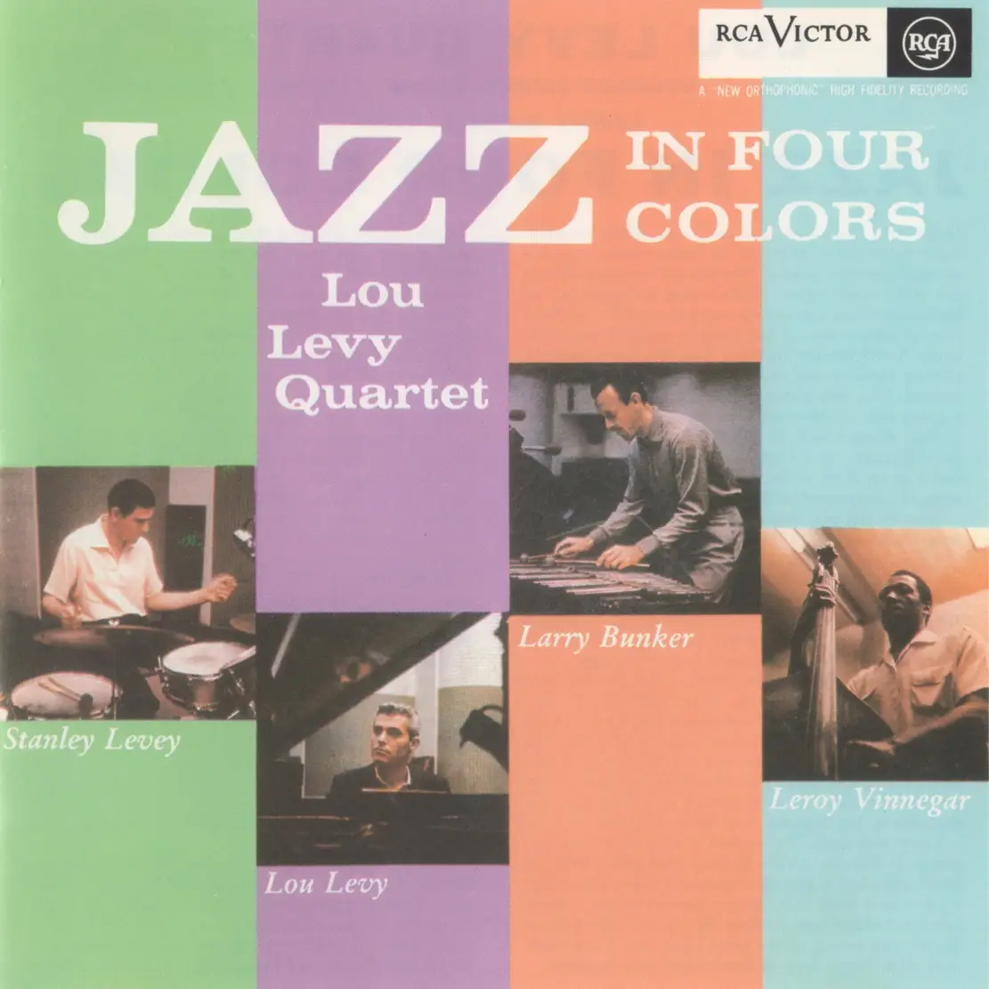 Lou Levy's first album for RCA was Solo Scene, recorded in February 1956, followed by Jazz in Four Colors, which was recorded on March 31 and April 2. The album was produced by Shorty Rogers and featured Larry Bunker (vib), Lou Levy (p), Leroy Vinnegar (b) and Stan Levey (d). As Rogers wrote on the back cover in the album's liner notes, “Planing this album, Lou and I spent much time trying to figure out a 'different' instrumentation. This was no small problem in face of the fact that so many albums are being made today. While trying to figure out an instrumentation, Lou went to work on a job that enabled him to renew one of his favorite musical acquaintances: Larry Bunker on vibes. Lou and Larry enjoyed playing together and made a wonderful nucleus for a quartet."