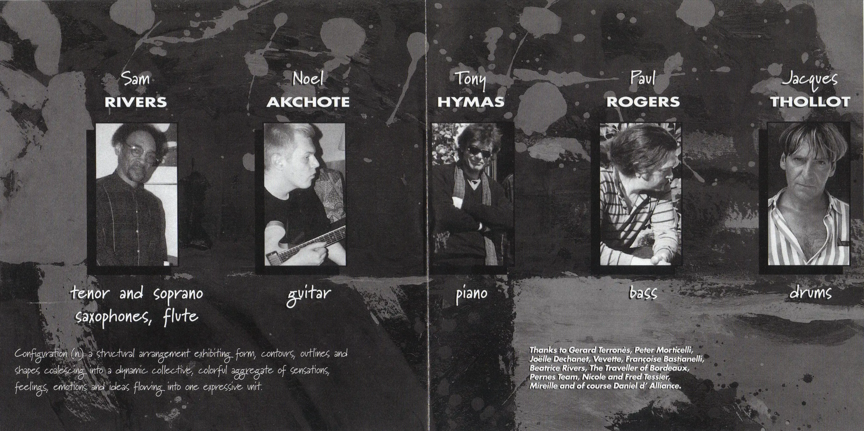 One of the most surprising recordings of the year (1998), Configuration finds venerable multi-instrumentalist Sam Rivers presiding over a very unlikely contingent of European musicians: Recyclers guitarist Noel Akchote, Mujician bassist Paul Rogers, pianist Tony Hymas, and drummer Jacques Thollot. Additionally, this isn’t an album comprised solely of extended, free improvisations; there is a wide array of compositions included in the program, and not all are by Rivers.
