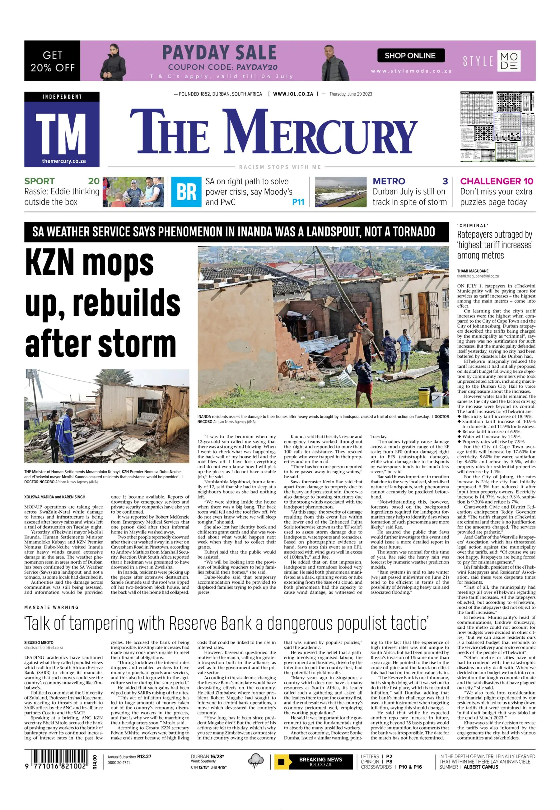 The Mercury is positioned to appeal to achievers with a high disposable income, and the upwardly mobile. This includes professionals, business people, opinion makers, political leaders, public servants, and academics as well as sports and arts enthusiasts. Its readers recognise that they should be plugged into their city, province and country and indeed the world to inform their decision-making and achieve success. The newspaper’s crisp and credible reporting ensures that readers get a “head start” every morning.