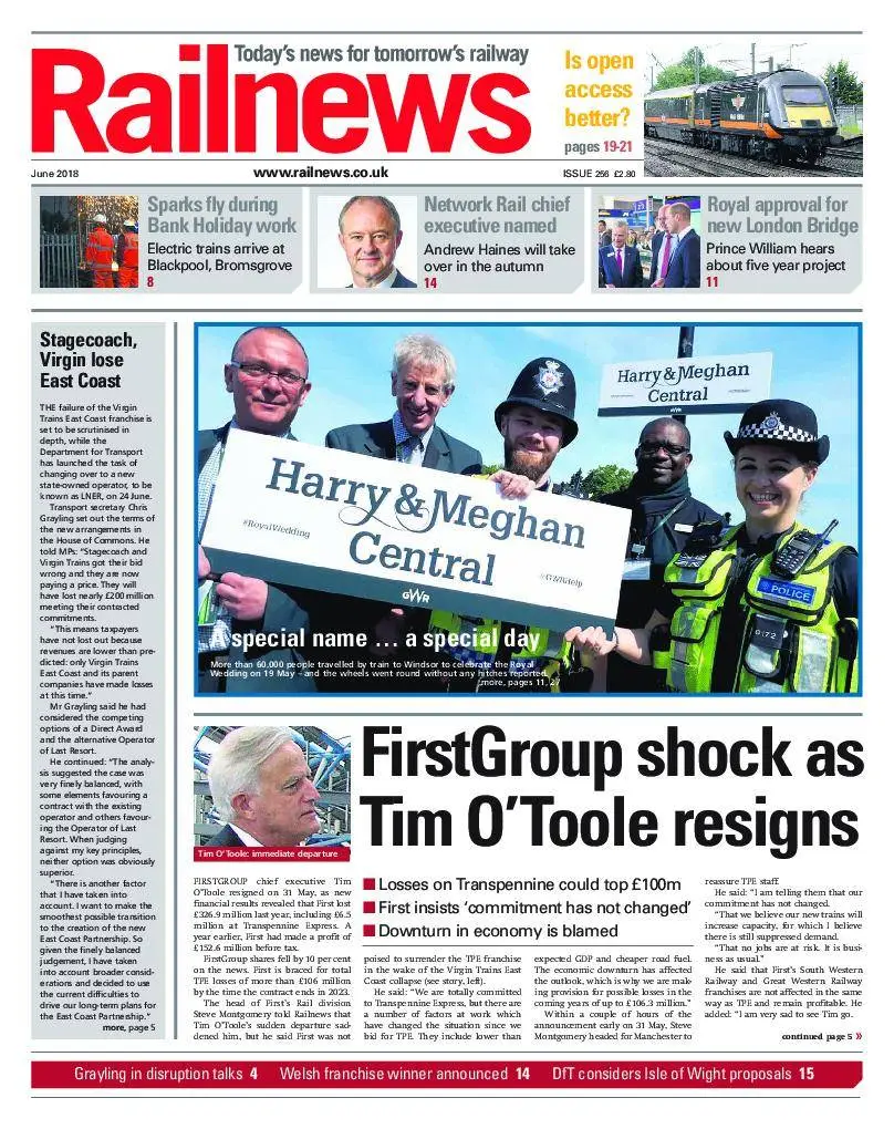 The lead story in Railnews for June is about the sudden resignation of Tim O’Toole as chief executive of FirstGroup, following the news that Transpennine Express could lose £106 million by 2023.