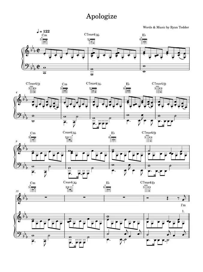 Apologize - OneRepublic (Piano-Vocal-Guitar (Piano Accompaniment))
