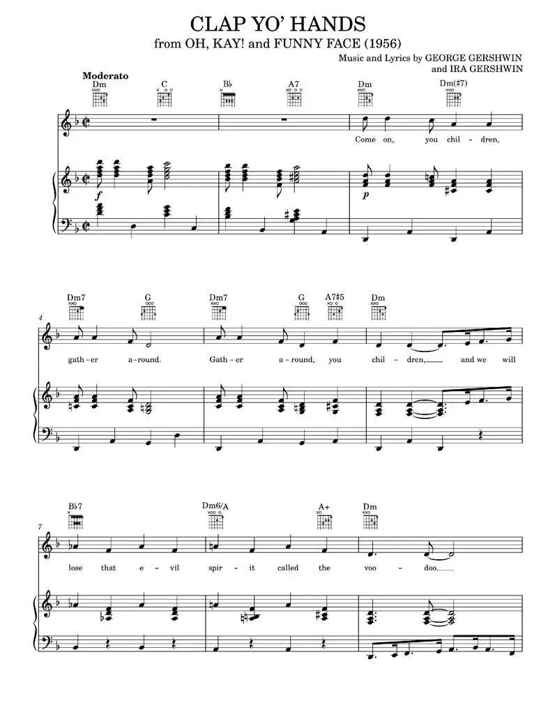 This piano-vocal-guitar sheetmusic, Clap Yo' Hands, includes Music and Lyrics by George and Ira Gershwin and was featured in the 1956 movies OH, KAY! and FUNNY FACE. It has a total of 5 pages and is written in F major and D minor with a total of 60 measures. This sheetmusic was originally performed by Fred Astaire and Kay Thompson, and is sure to add a touch of old-school charm to your performance.