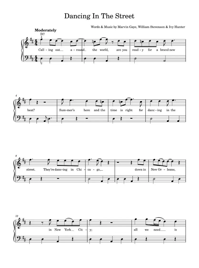 This sheetnotes file is for the classic Motown hit "Dancing In The Street" by Martha & The Vandellas Reeves, written by Marvin Gaye, William Stevenson, and Ivy Hunter. It features an easy piano arrangement of the song in two pages of sheet music. The song is written in D major and B minor, and features a total of 34 measures.