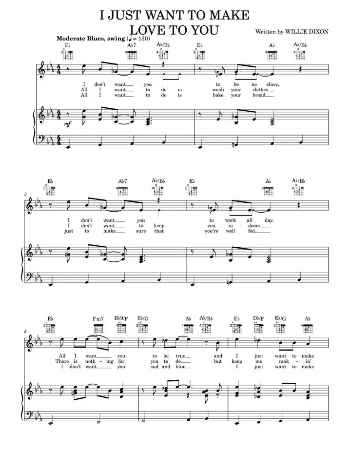 This sheet music features the song "I Just Want To Make Love To You" by Foghat, Muddy Waters, and Willie Dixon. This two-page music book gives pianists, vocalists, and guitarists all the tools necessary to play this classic rock track, composed by Willie Dixon. The song is in E♭ major and C minor and spans across 18 measures. With just a few musicians, this unforgettable song can be brought to life.