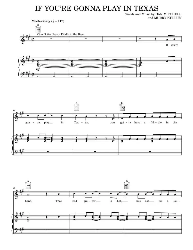 If You're Gonna Play In Texas (You Gotta Have A Fiddle In The Band) - Carpenters Alabama (Piano-Vocal-Guitar)